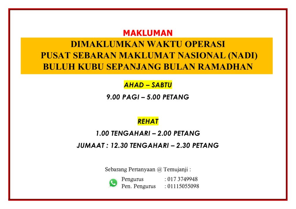 Sepanjang bulan Ramadan, NADI akan beroperasi mengikut jadual berikut: