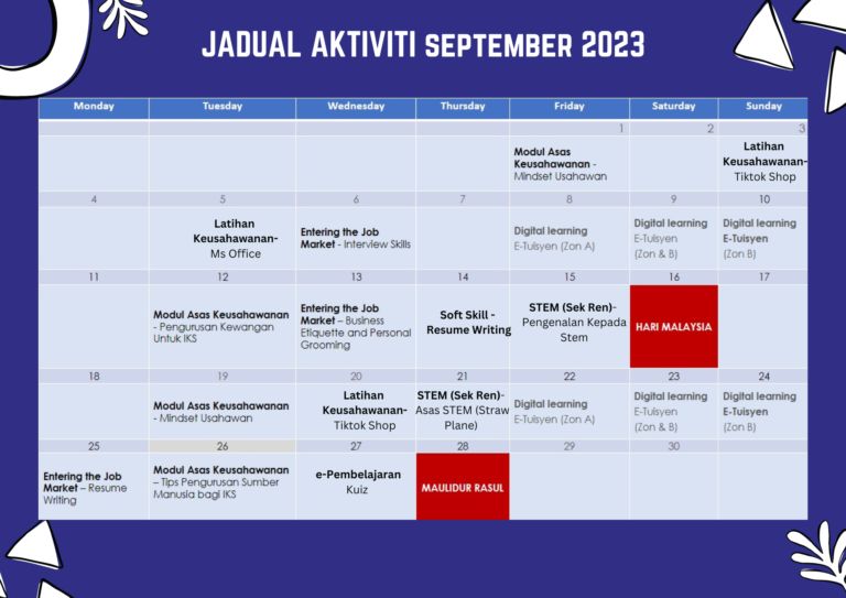 Tarikh : 14 September 2023 Masa : 10.00 – 12.00 Petang Tempat : Pusat Ekonomi Digital Buluh Kubu Peserta : 1 Orang Tujuan Memberi pendedahan asas membuat resume kerja supaya […]