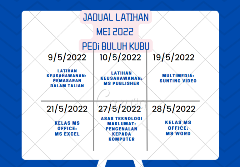 Tarikh : 9 MEI 2022 Masa : 9.00 – 12.00 Petang Tempat : Pusat Internet Buluh Kubu Peserta : 3 Orang Tujuan Kelas ini bertujuan untuk melatih para pelajar sekolah supaya […]