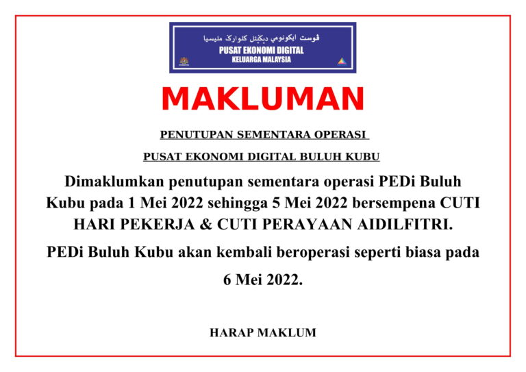 NOTIS PENUTUPAN SEMENTARA PEDi BULUH KUBU SEMPENA CUTI HARI PEKERJA & CUTI PERAYAAN AIDILFITRI