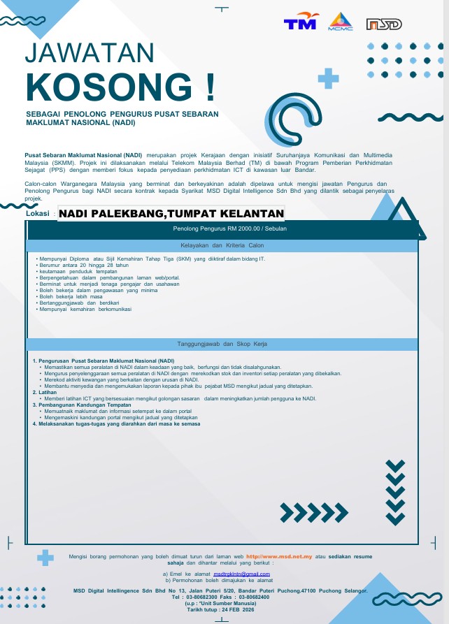HEBAHAN IKLAN KEKOSONGAN JAWATAN PENOLONG PENGURUS NADI PALEKBANG