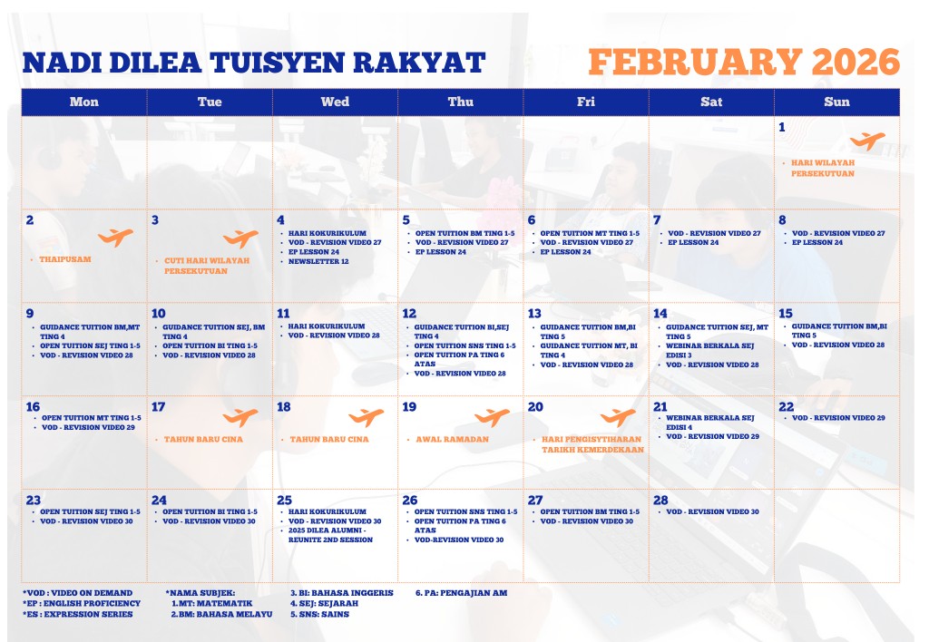 JADUAL KELAS DILEA TUISYEN RAKYAT FEBRUARI 2026
