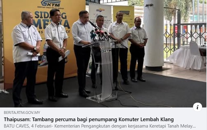 Kementerian Pengangkutan dengan kerjasama Keretapi Tanah Melayu Berhad (KTMB) akan menyediakan perkhidmatan KTM Komuter Lembah Klang secara percuma pada 10 dan 11 Februari ini sempena perayaan Thaipusam.